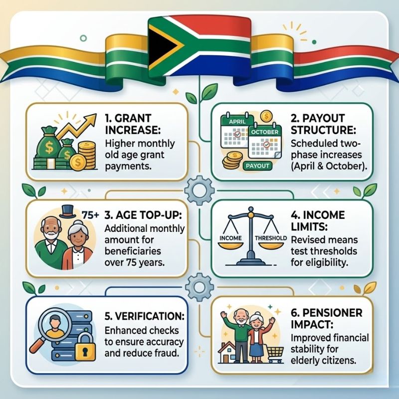 People who could get the SASSA Pension Increase in 2026 need to know what they need to do to get it. People who want to get the benefits must be at least 60 years old. Also, applicants must pass a means test that checks their income and assets. You can only apply if you live in South Africa and have a valid ID. Pensioners should also check that their bank information is current so that payments don’t get held up. These requirements make sure that grants go to people who really need money help in their retirement years.